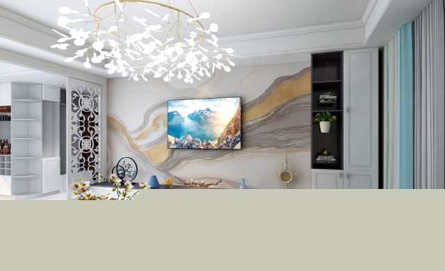 5米的大客廳背景墻為大理石雕刻花紋配輕奢款定制電視柜,外邊買不到的專款專用電視柜。