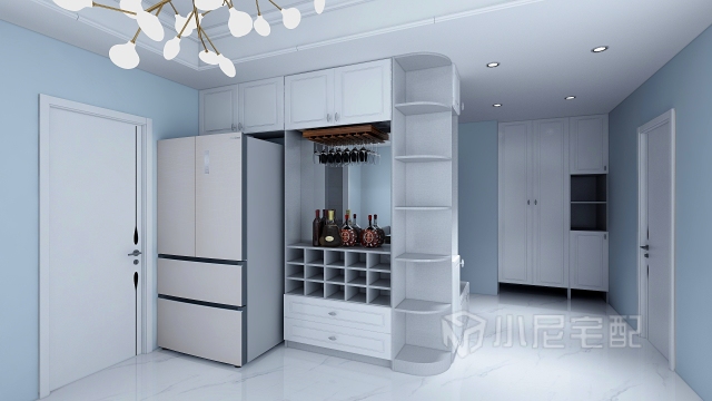 進(jìn)門左側(cè)為夏季長(zhǎng)裙,秋冬季長(zhǎng)款衣物的衣柜,兩個(gè)無門柜可以隨手放包包一類的小件。右側(cè)為以換鞋凳為一體的玄關(guān)柜連接餐廳的酒柜