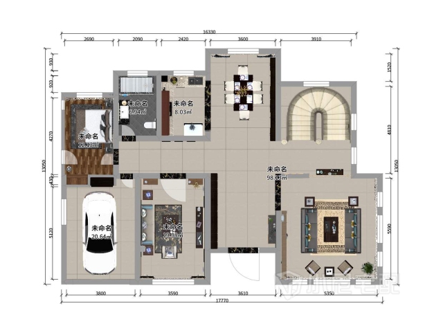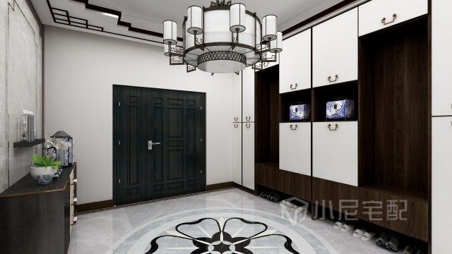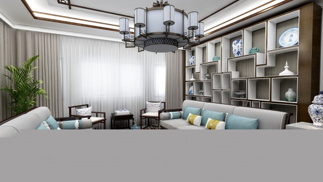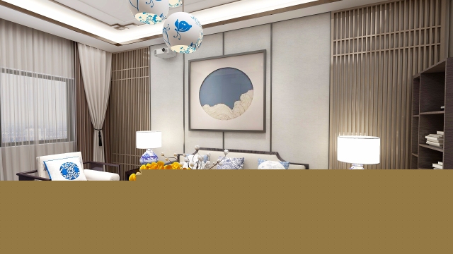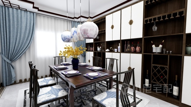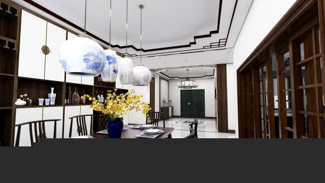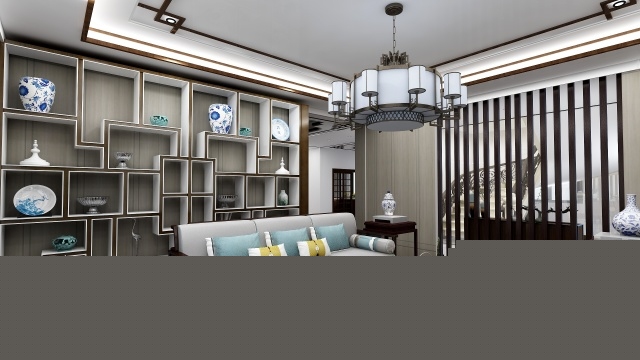 這是一個以瓷元素為裝飾元素的新中式風格的別墅的一層,包括客廳、餐廳、視聽室、廚房、保姆房以及車庫。