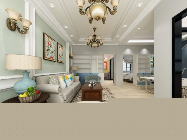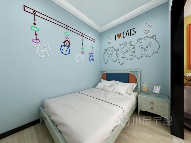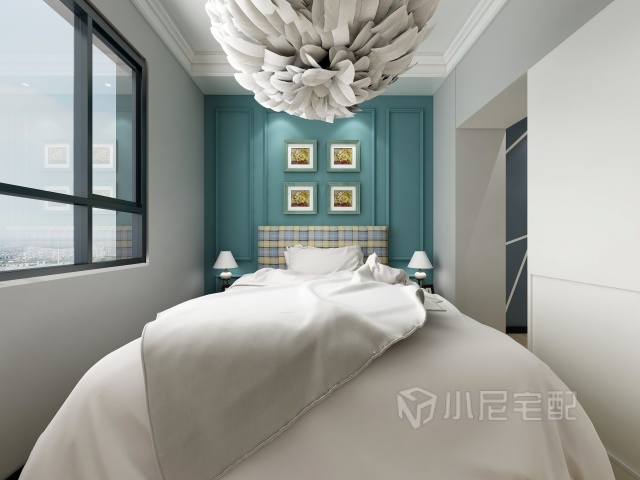此臥室,看似簡單其實大有玄機,看到天花板上的燈了么,這可不是一個簡單的燈,這是一個羽毛燈,這是一個吉祥的象征好比白鳥朝鳳這個燈就是鳳凰。床頭背景那就更不一般了,為什么不一般呢因為是藍色的。