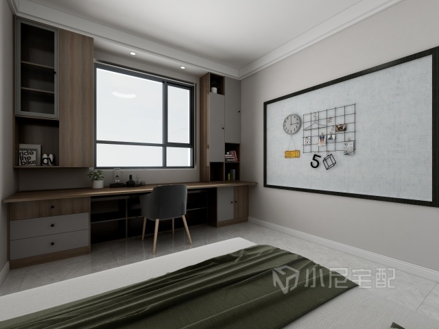 柜子和書桌融為一體。照明燈的精確布局雖然照亮的地方不多,但是卻集中在書桌的一米范圍。讓資源得到充分的利用。