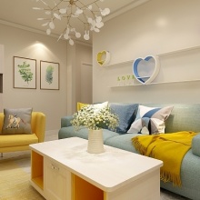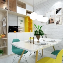 霧藍色的墻面遇見暖暖的黃色燈光,碰撞出不一般的顏色。