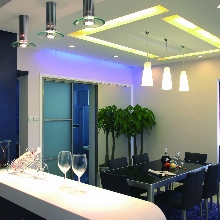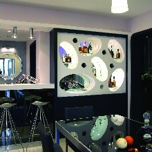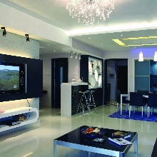 酒柜及沙發背景墻飾橢圓形蜂巢的奇特造型寓意專為新婚業主打造的甜蜜“愛巢”。而隱含在空間各部位的“L”造型元素是將男女主人姓氏拼音首位字母與他們的新居巧妙地結合在一起,全屋紫灰熏衣草色系綴以藝術玻璃、灰鏡等材質,營造出對比強烈的時尚氣息,彰顯出業主的不凡品味。家裝家具一體價:19萬。