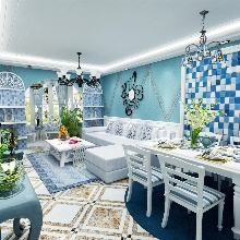 地中海風格以藍色為基調(diào),有文藝、清爽感,常見的燈塔、帆船、海星等小裝飾也給家裝增添了不少海洋清新感。整個家居設計展現(xiàn)蔚藍色的浪漫情懷,海天一色、艷陽高照的純美自然氣息。家居家裝一體價:15w。
