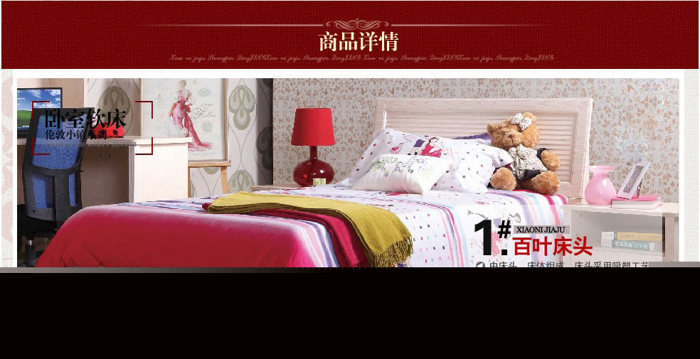 | 規格 | 床頭:270*128*927mm 床體:2035*1260*323mm 床墊:1200*2000*200mm 排骨架:1200*2000*50mm 衣柜:908*533*2075mm 字臺:1200*1080*1995mm 床頭柜:558*401*448mm |