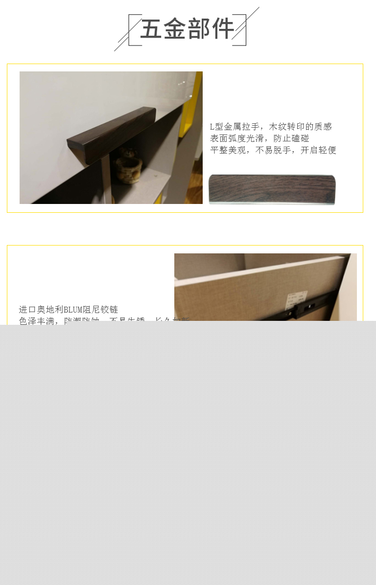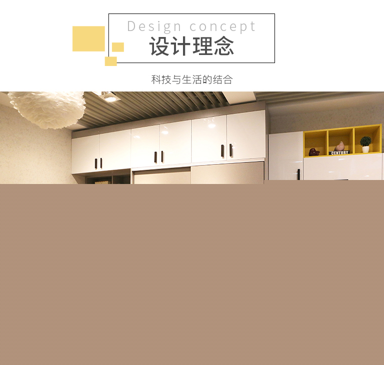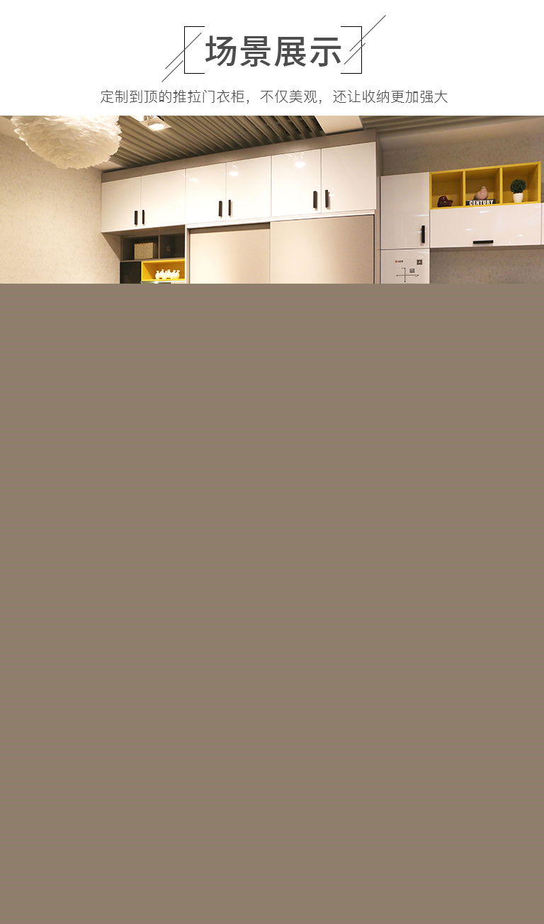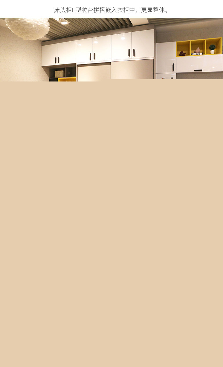 | 細節描述 | 定制到頂推拉門衣柜,亮白吸塑和灰布紋的搭配,較之純木色家具更為年輕,都市感更強。床頭柜妝臺L型拼搭,更顯整體。梳妝臺化妝品可以分區放置,生活更精細化。多工能魔鏡,顯示溫度濕度,方便出門的時候搭配適當的衣物,藍牙播放器功能,讓生活更有品味和樂趣。 |