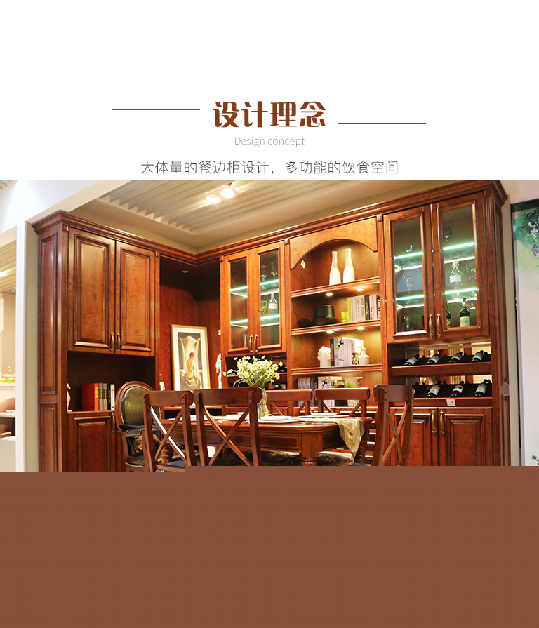 | 細節描述 | 餐廳餐邊柜需要大體量多功能。餐邊柜內部格局的設計合理,敞開式的層板上和玻璃門板可以擺放書、畫冊、裝飾品以及漂亮的餐具,在柜體的部分空間加裝柜門,里面可以存放餐巾布、食物等比較瑣碎的物品。還有收納功能儲物柜,可以供放置碗碟筷、酒類、飲料類,以及臨時放湯和菜肴用,也可放置客人包小物件,酒插格放置美酒,每一次吃飯都是享受。 |