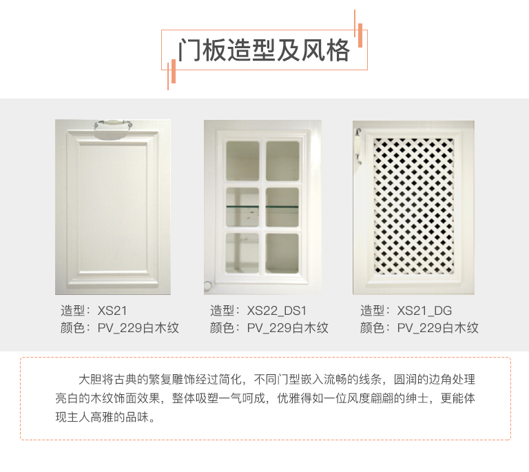 | 產品特點 | 強調一種優雅、含蓄、內斂的生活態度。在保留簡約歐式氣息的前提下將原來傳統的復雜雕花與現代元素相結合,締造出一種全新“簡約歐式風格”。 |