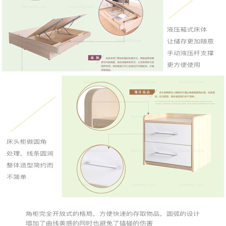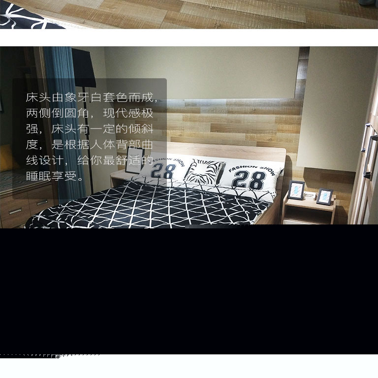 | 規(guī)格 | 床頭:1570*115*927mm 床體:2037*1562*401mm 床頭柜:498*400*450mm 對開門衣柜:900*580*2300mm 角柜:400*600*2300mm 床墊:1800*2000*100mm |