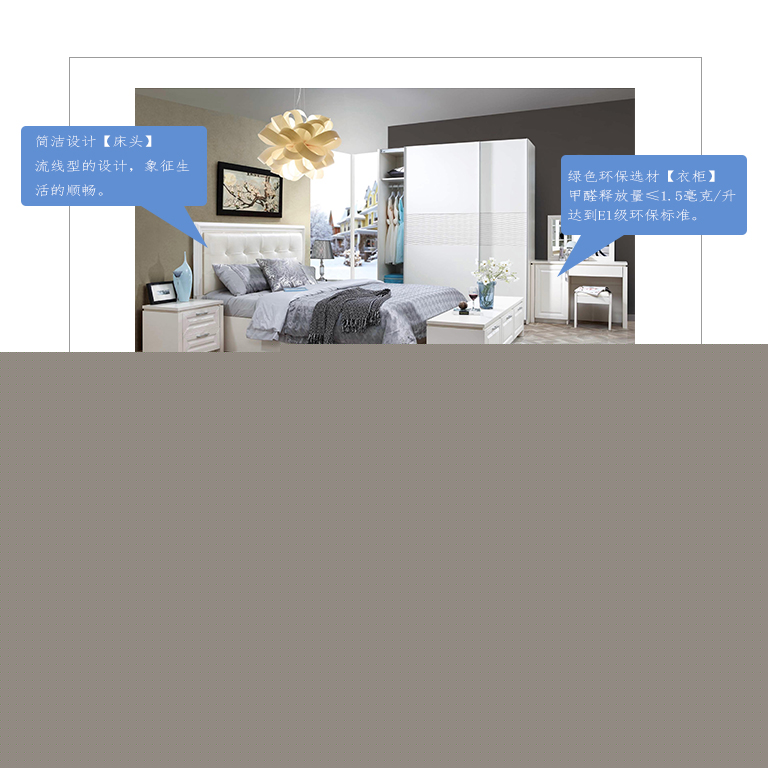 | 規(guī)格 | 外掛門衣柜:2000×605×2250mm、床頭柜:552×400×477mm、軟床:2103×1910×360mm、床墊:1800×2000×260mm、臥房電視柜:1880×450×415mm、妝臺:1100×400×760mm、妝凳:400×300×420mm |