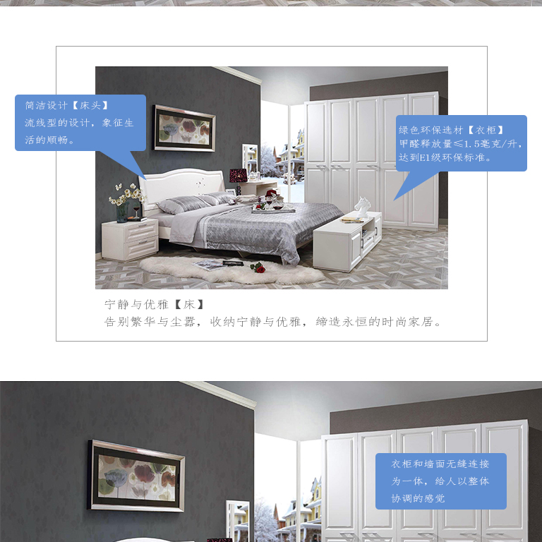 | 規格 | 外掛門衣柜:2250×580×2250mm、床頭柜:520×400×429mm、床:2155×1910×360mm、床墊:1800×2000×250mm、臥房電視柜:1700×400×429mm、妝臺:1020×400×1510mm、妝凳:400×310×450mm |