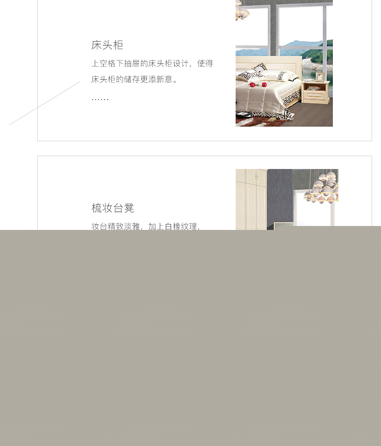 | 規格 | 單人床:1570*2128*927mm 床墊:1500*2000*200mm 床頭柜:558*401*448mm 推拉門衣柜:2316*633*2775mm 梳妝臺:596*400*1430mm 梳妝凳:400*250*470mm |