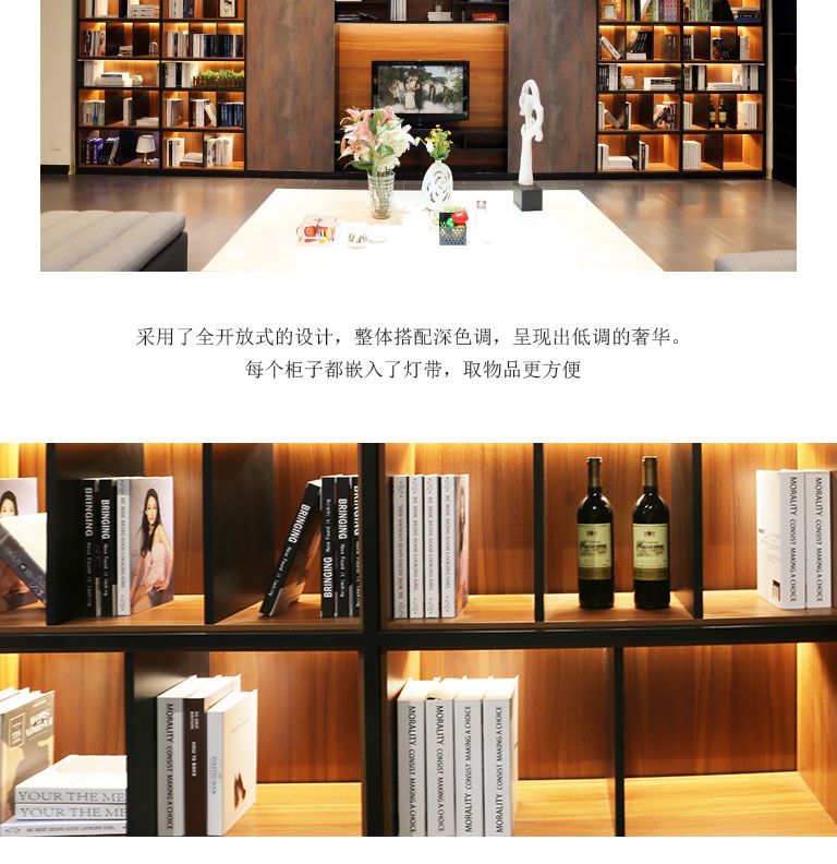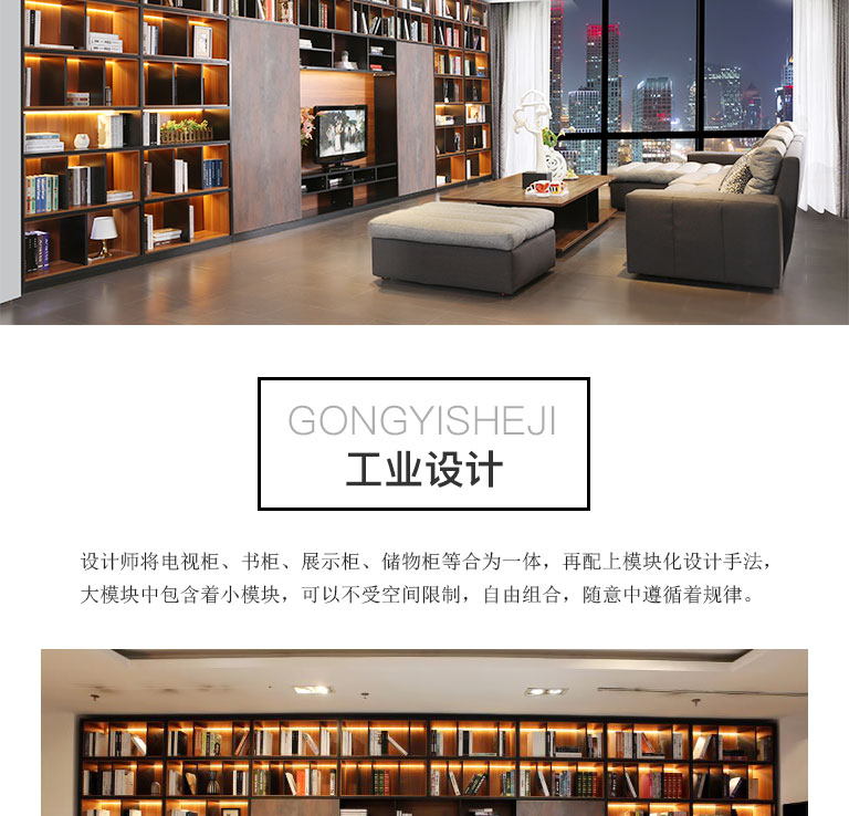 | 細節描述 | 設計師將電視柜、書柜、展示柜、儲物柜等合為一體,再配上模塊化設計手法,大模塊中包含著小模塊,可以不受空間限制,自由組合,隨意中遵循著規律。 |