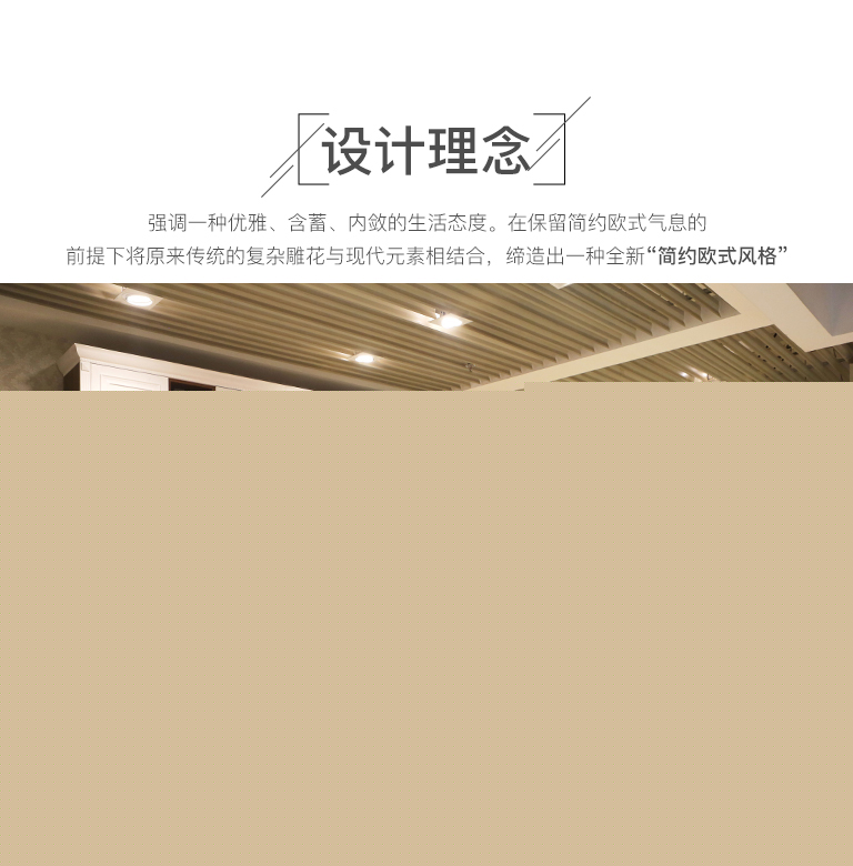強調一種優雅、含蓄、內斂的生活態度。在保留簡約歐式氣息的前提下將原來傳統的復雜雕花與現代元素相結合,締造出一種全新“簡約歐式風格”。