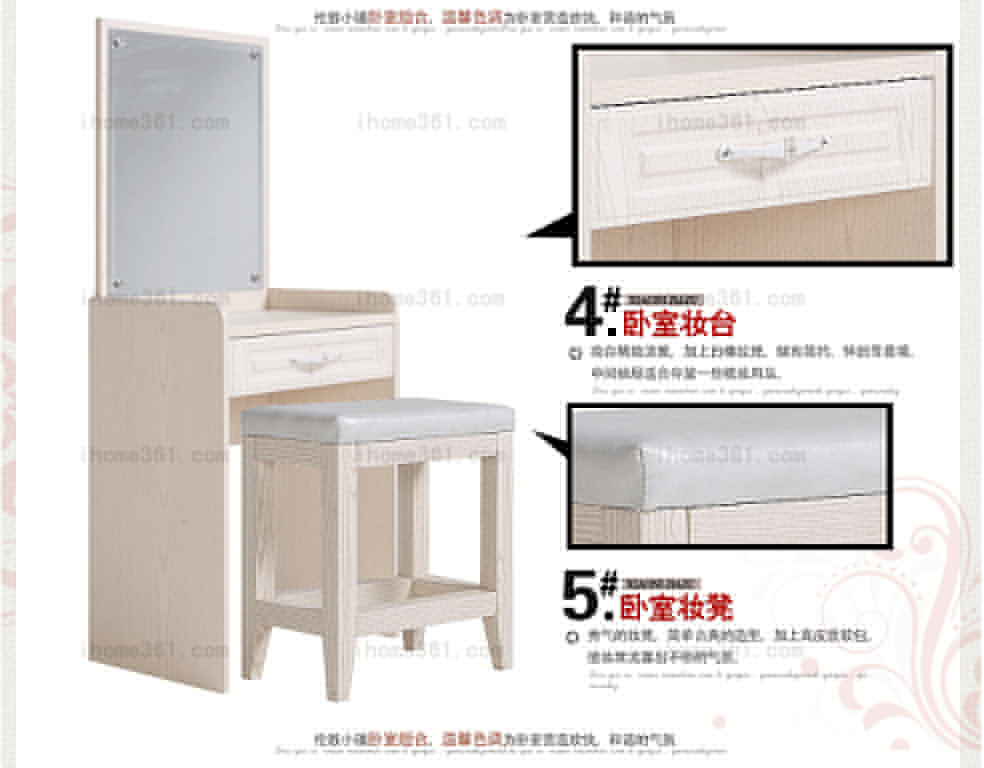 | 細(xì)節(jié)描述 | 床的床頭采用優(yōu)質(zhì)珍珠粉皮,質(zhì)感細(xì)膩,柔然舒服,環(huán)保不變形;床頭柜分兩種,雙屜、上空格下抽屜,使床頭柜儲(chǔ)存多樣;床尾柜體分區(qū)合理,配上古典懷舊的白橡紋理,更顯時(shí)尚感;妝臺(tái)精致淡雅,加上白橡紋理,賦有簡(jiǎn)約、古典的造型;妝凳以秀氣的形象與妝臺(tái)相搭配,使他們流露出不俗的氣質(zhì);衣柜則融合了西方的古典風(fēng)格和東方的現(xiàn)代神韻,儲(chǔ)存功能齊全、分區(qū)明確。 |